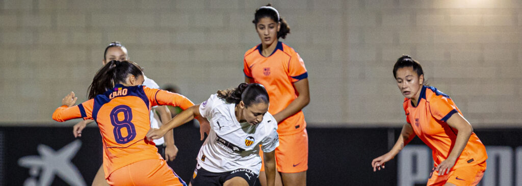 Derrota inmerecida del Valencia CF Femenino en el minuto 93. Tras empatar el 0-1 inicial de Celia Segura (min. 9) gracias al tanto de M. Martí (min. 13), el conjunto del Puchades se vació sobre el campo, pero nuevamente Celia Segura firmó el gol definitivo para el FC Barcelona B. El Valencia CF Femenino comenzó el encuentro sin complejos ante el filial azulgrana en esta 12ª jornada de la Primera División Iberdrola 25-26.