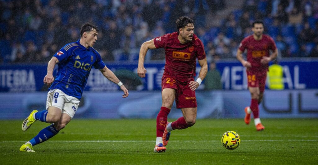 El partido comenzó con un Oviedo que presionó con intensidad la salida de balón del Valencia, obligando a los de Corberán a jugar en largo y a perder sistemáticamente las segundas jugadas. El arranque fue espeso, sin ritmo ni ocasiones claras, en el que apenas se registraron dos disparos lejanos sin peligro, uno de Thiago Fernández y otro de Umar Sadiq. El Valencia solo amagó con despertarse con una buena combinación acabó con Ramazani disparando desviado desde la frontal tras una asistencia de Ugrinic.