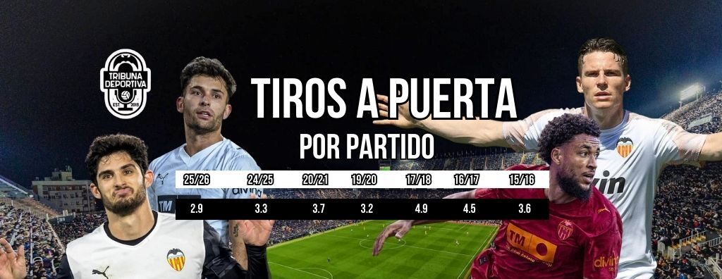 El Valencia CF atraviesa una de sus etapas más pobres en producción ofensiva de los últimos años. Según los datos de Sofascore, en la temporada actual es el segundo equipo que menos tiros a puerta realiza por partido, con solo 2,9, una cifra que lo sitúa únicamente por delante del Getafe (2,7). Es la primera vez que el conjunto valencianista baja de la barrera de los tres disparos a puerta por encuentro desde la llegada de Peter Lim, un dato que refleja con claridad las dificultades del equipo para generar peligro real.