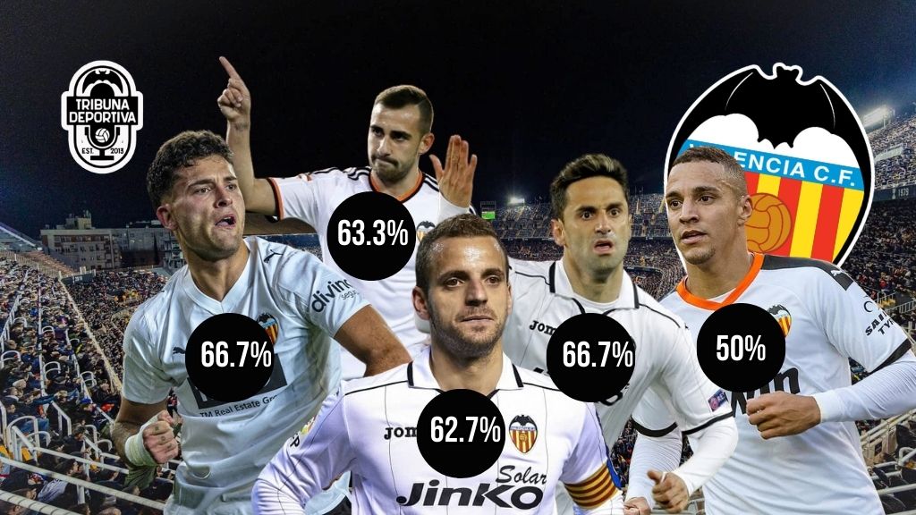• Santi Mina – 29 goles en Liga, 17 en Mestalla → 58,6%