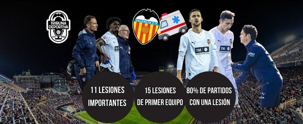 Este curso, hasta 15 jugadores del primer equipo han sido baja por lesión, lo que supone más del 50% de la plantilla. Además, 11 de ellas de gravedad, con un mínimo de tres semanas fuera de los terrenos de juego. En las 25 jornadas disputadas, el Valencia CF solo ha logrado completar cinco sin ningún lesionado. En el resto, el equipo siempre ha tenido al menos una ausencia por problemas físicos, lo que equivale al 80% de los partidos.